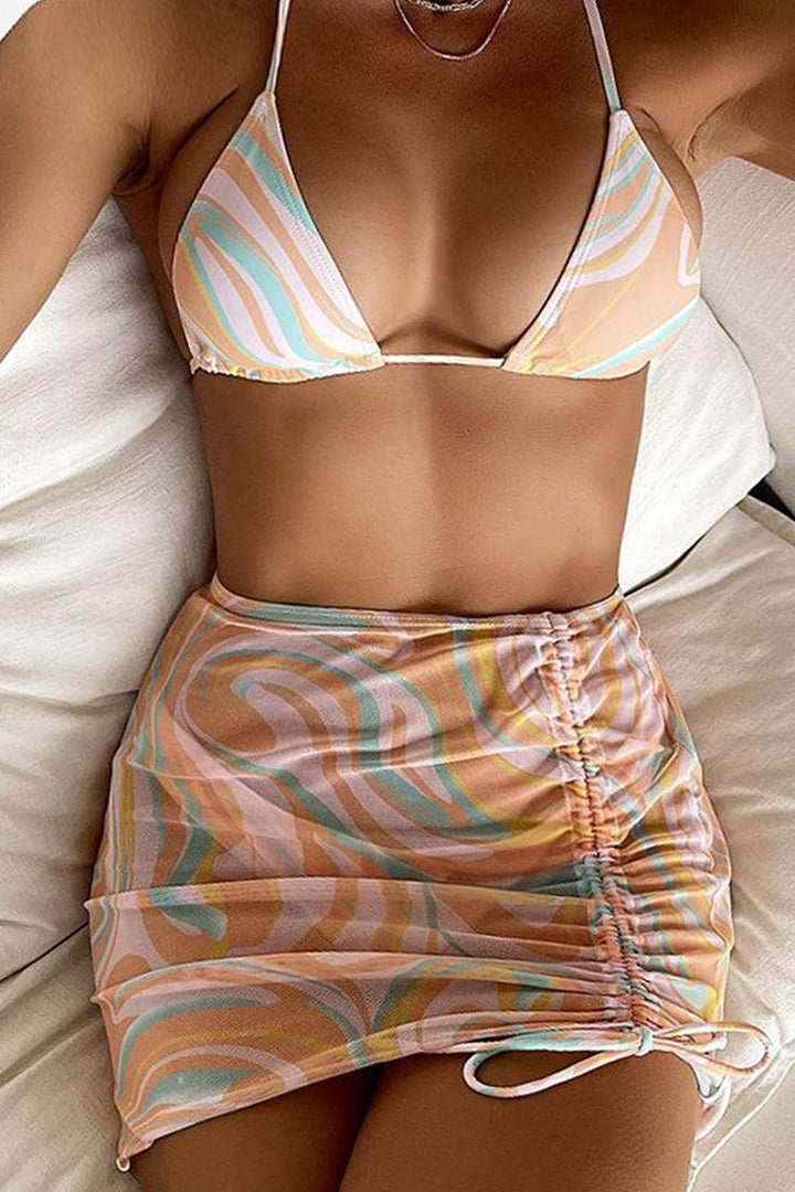 Light Orange Printed Halter Sexy Three Piece Swimsuit