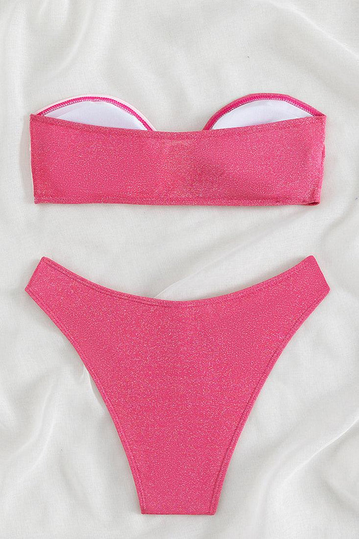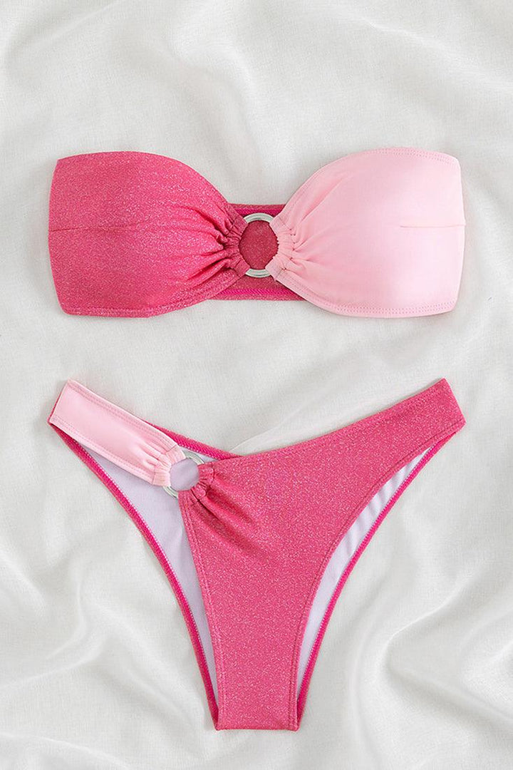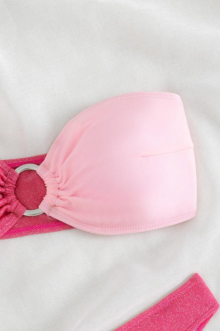 Pink Glitter O-RIng Bandeau Cheeky 2Pc Sexy Swimsuit Set Bikini