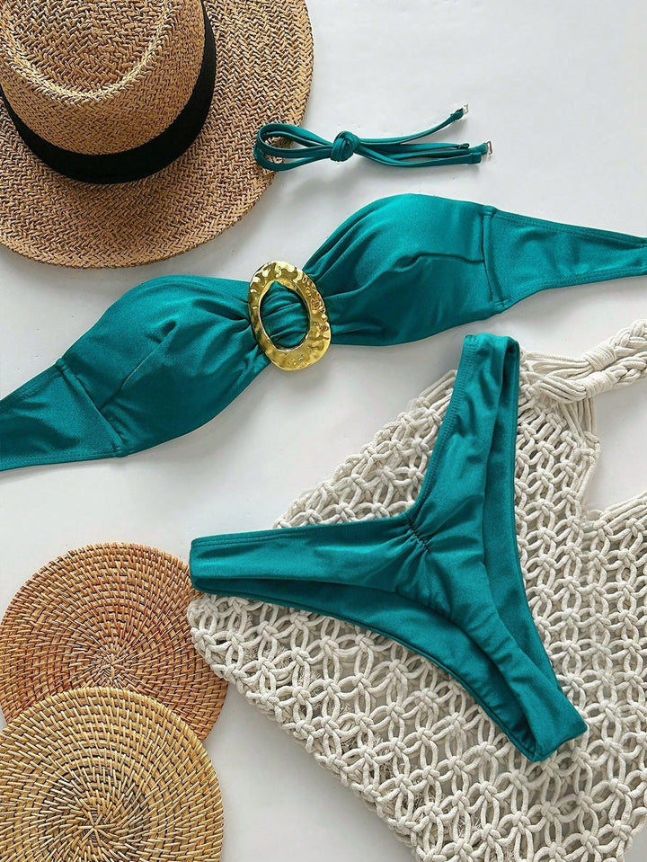 Turn heads at the beach with this playful two-piece bikini featuring a jade green bandeau top adorned with shimmering gold accents. The ruched design and cheeky thong bottom highlight your curves for a flirty, confident look. Perfect for sun-soaked days and poolside fun!