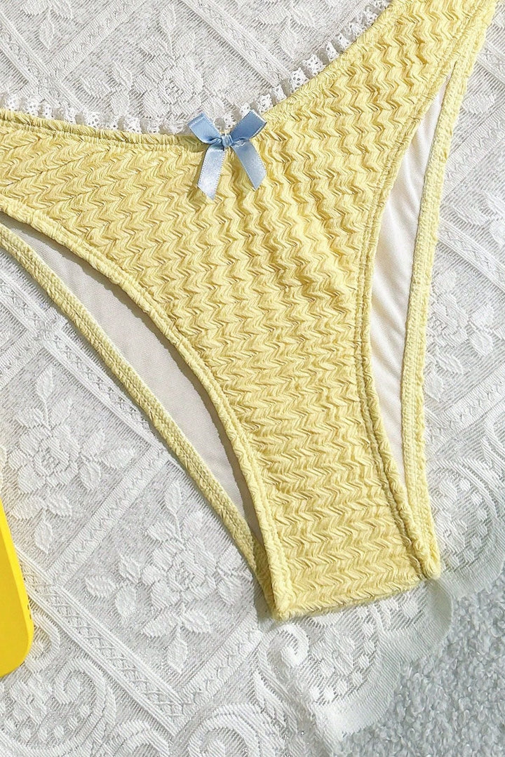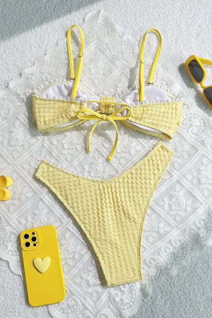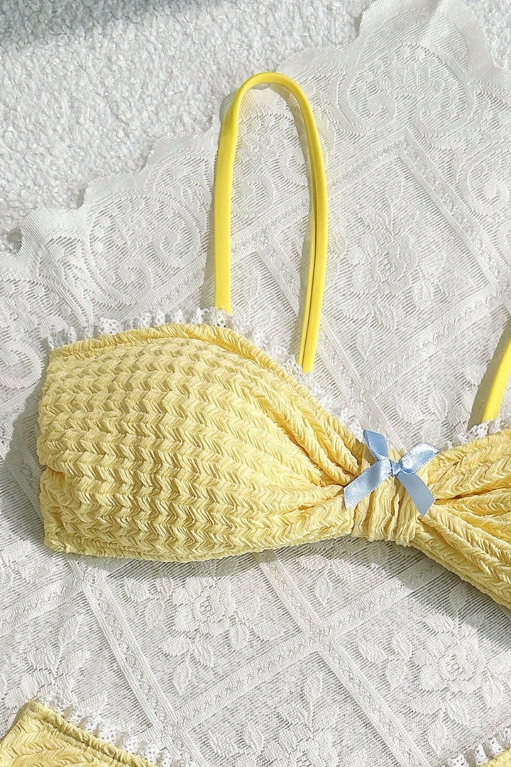 Yellow Textured Bow Lace Sexy 2Pc Swimsuit Set Bikini