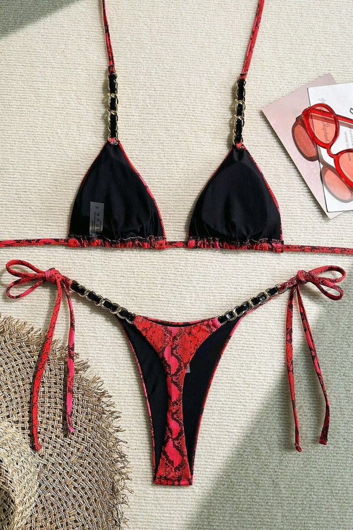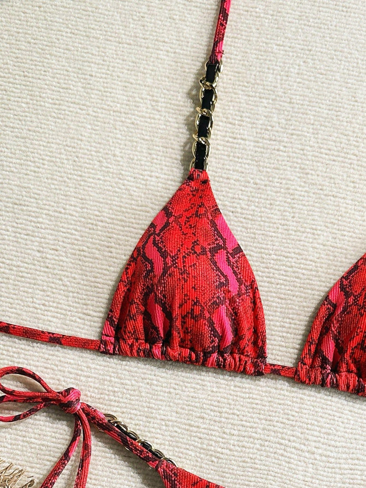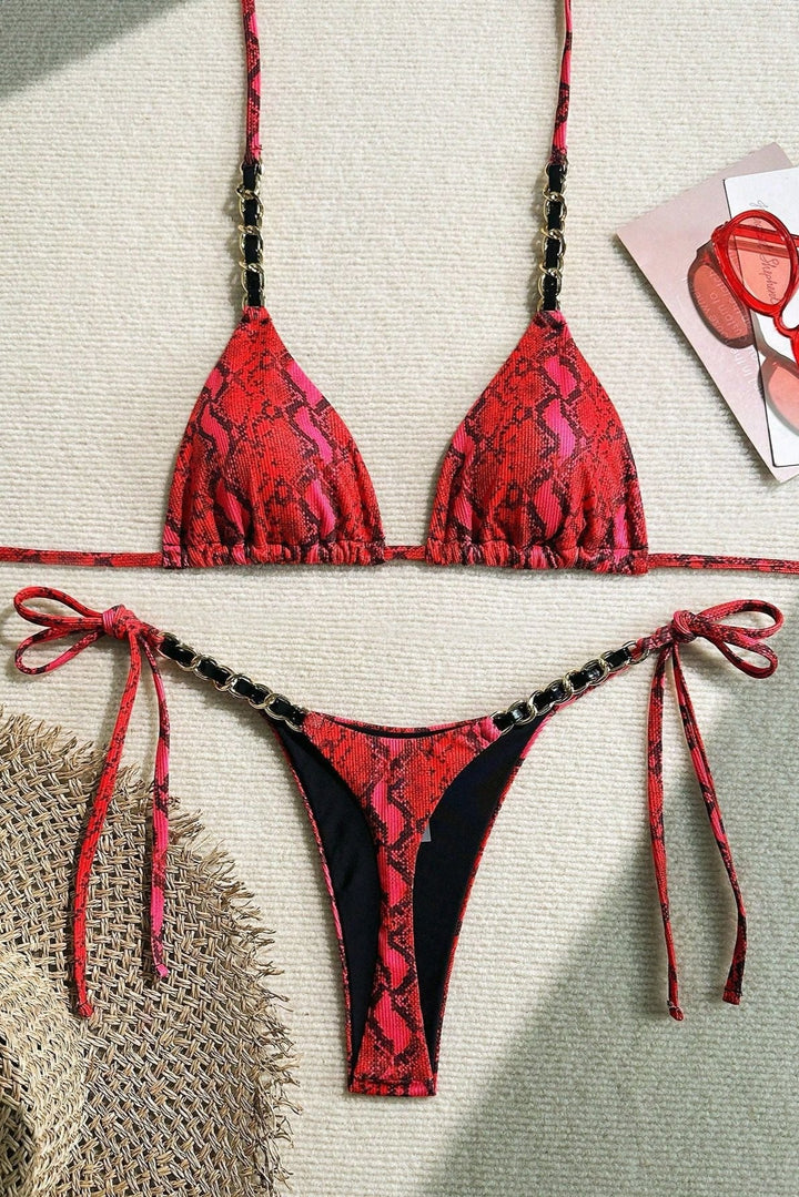 Red Snake Print Chain Thong Sexy 2Pc Swimsuit Set Bikini