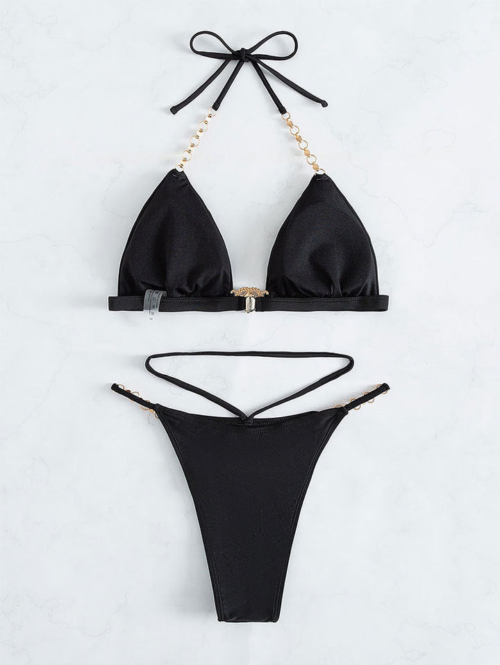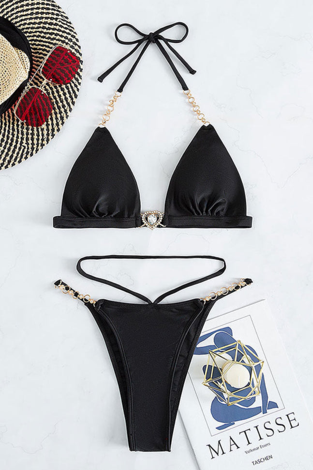 Turn heads at the beach or pool with this Black Heart Rhinestone Strappy 2Pc Swimsuit Set. Featuring sparkling rhinestone accents and playful tie details, this sexy bikini adds a touch of glam to your swimwear collection. The strappy design offers a flirty, confident look perfect for sunny days and summer nights.