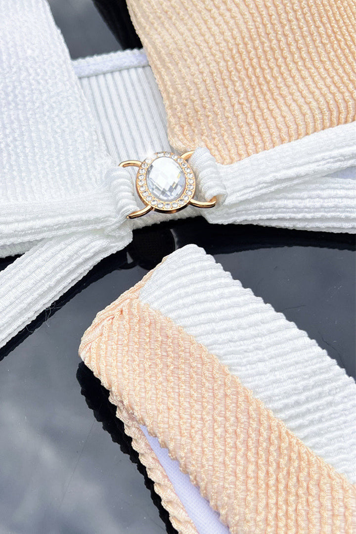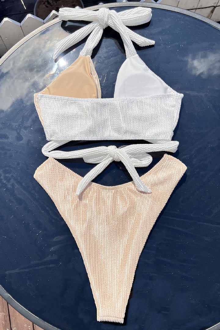 White Beige Rhinestone Halter Body Contour Bottom 2Pc Sexy Swimsuit