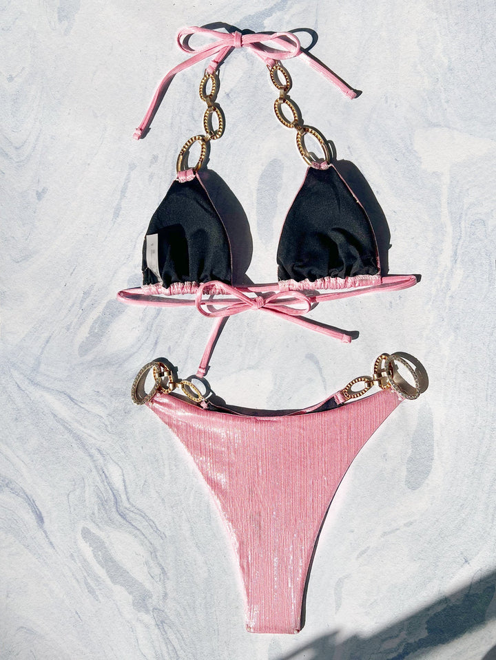 Pink Shimmer Halter Rhinestone Ring Detail Cheeky 2Pc Swimsuit Set