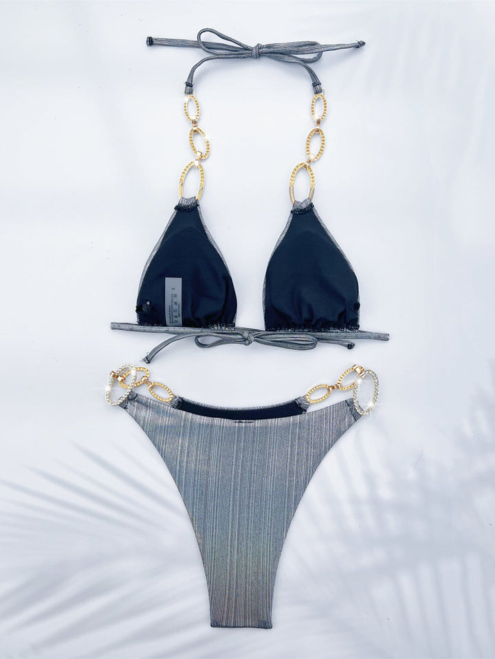 Silver Shimmer Halter Rhinestone Ring Detail Cheeky 2Pc Swimsuit Set