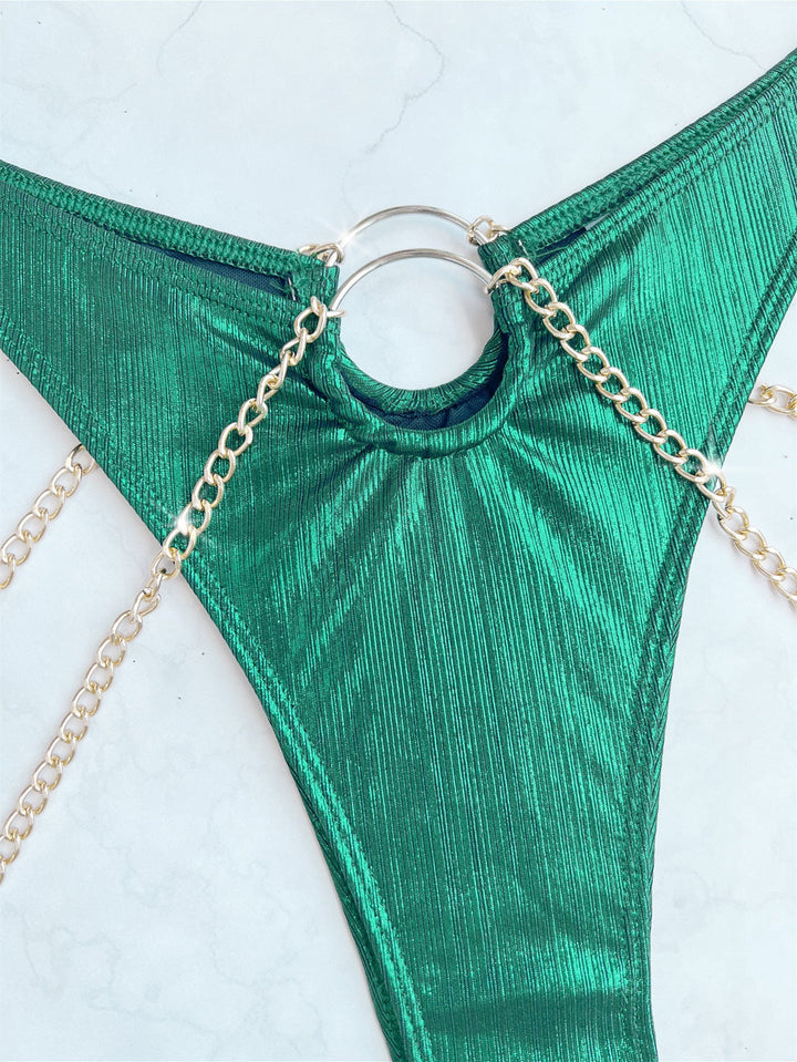 Green Shimmer Metallic Gold Chain Bandeau Cheeky Sexy 2Pc Swimsuit Set