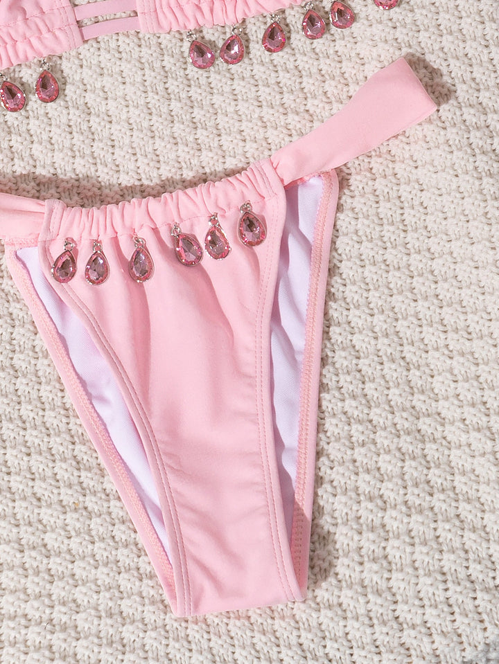 Light Pink Rhinestone Big Gem Triangle Cheeky Sexy 2Pc Swimsuit Set