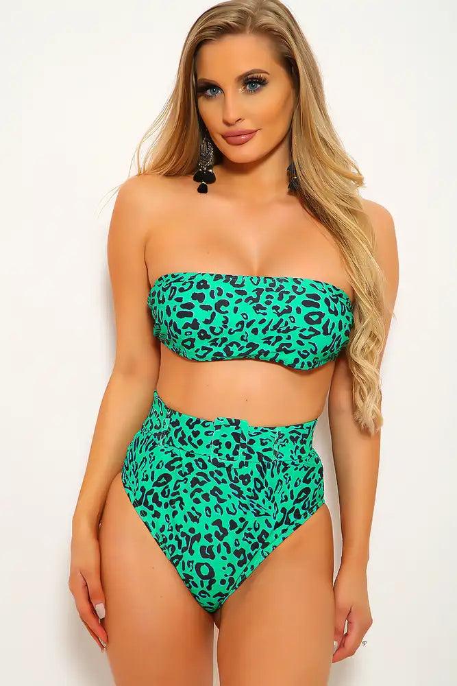 Green Leopard Print Strapless Two Piece Swimsuit