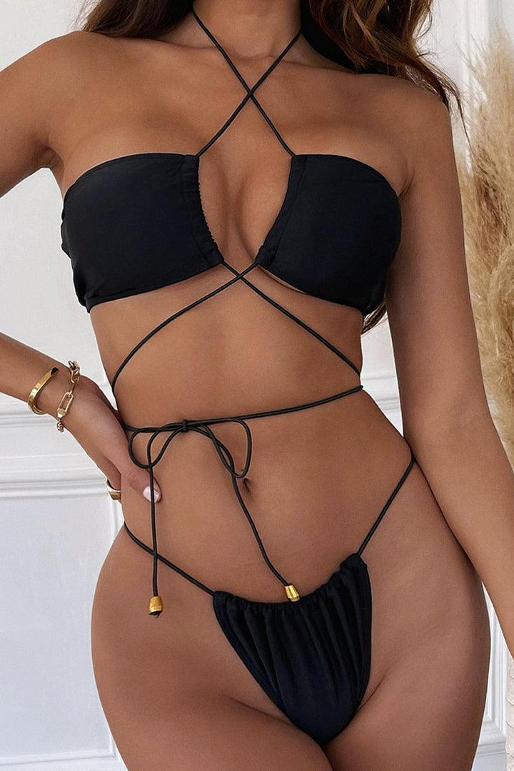 This 3 piece swimsuit is so cute for any pool party! Featuring; halter, mesh, tie straps, strappy, coverup skirt, two tone, printed, matching bottoms. Followed by a sexy wear. 90% polyester 10% spandex