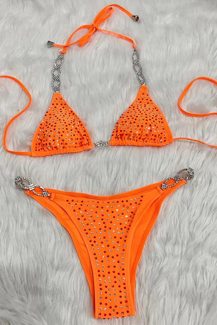 Orange Silver Rhinestone Accent Sexy Two Piece Swimsuit