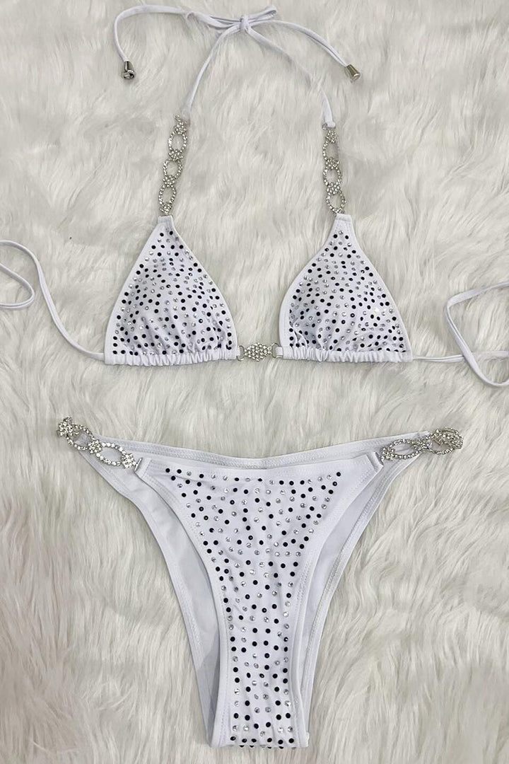 White Silver Rhinestone Accent Sexy Two Piece Swimsuit