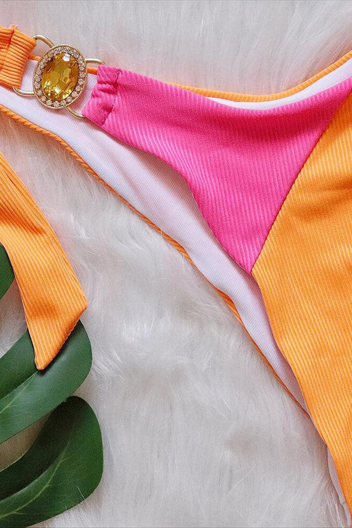 Pink Orange Rhinestone Gem Ribbed Bandeau 2 Pc Bikini