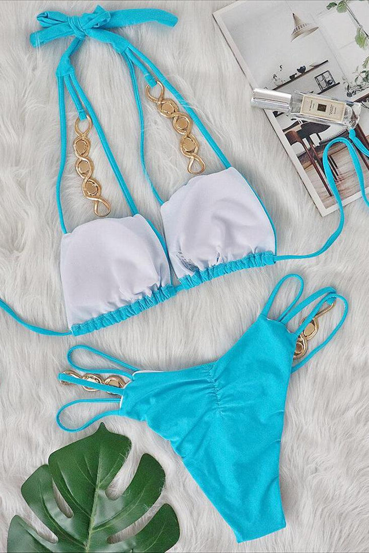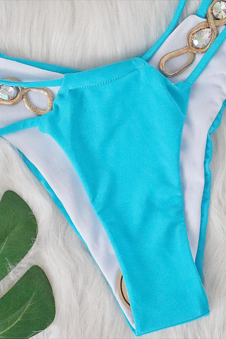 Add some sparkle and fun to your beach look with our Blue Strappy Big Rhinestones Cut-Out Cheeky 2Pc Swimsuit Bikini! The beautiful blue color and strappy detailing combine with big sparkling rhinestones and a cheeky cut to make you stand out. Perfect for a playful day in the sun!