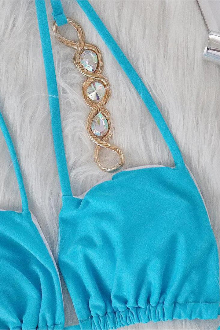 Blue Strappy Big Rhinestones Cut-Out Cheeky 2Pc Swimsuit Bikini