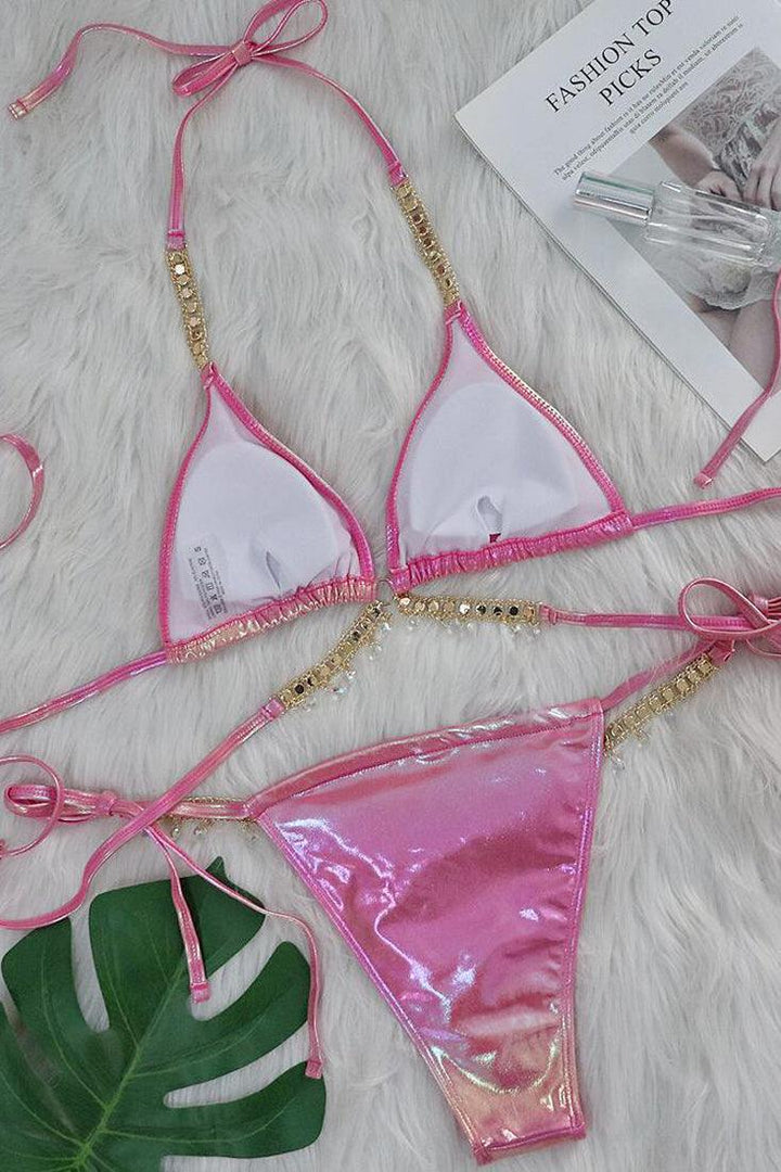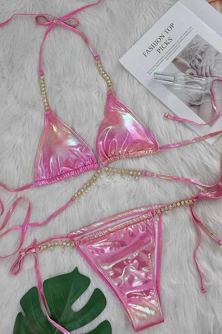 Pink Holographic Rhinestone Starfish Strappy Draw String Cheeky 2Pc Swimsuit Set Bikini