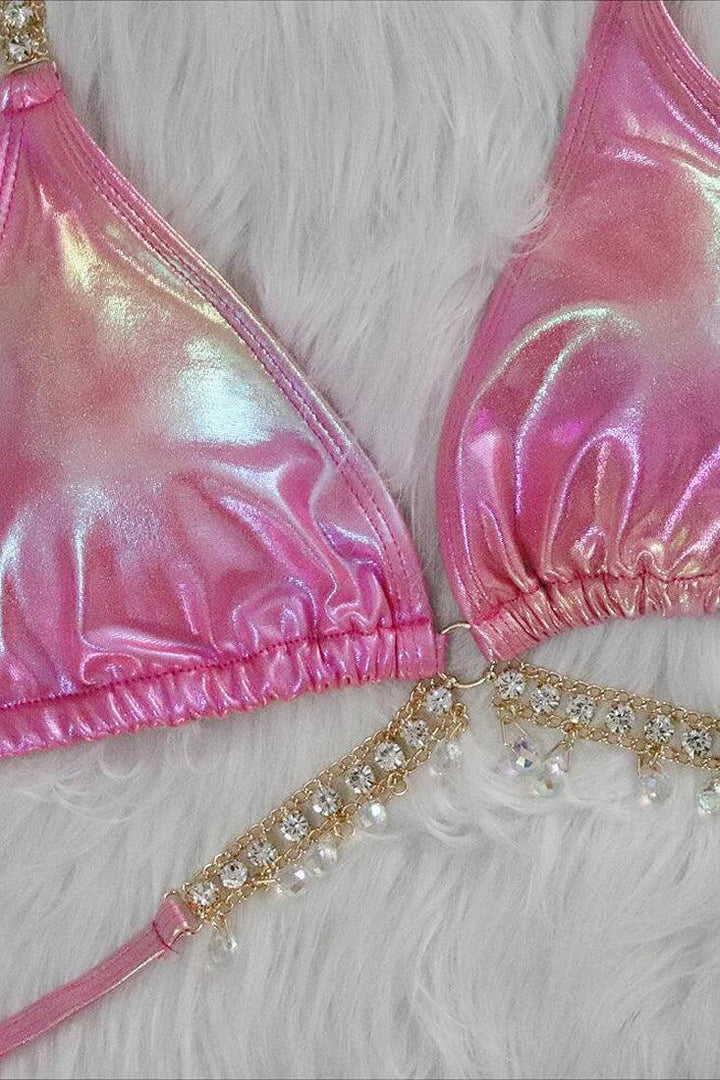 Stand out in our Pink Holographic Rhinestone Starfish Bikini! This dazzling strappy swimsuit set features a cheeky drawstring bottom and eye-catching holographic starfish. Perfect for beach babes who love to shine!