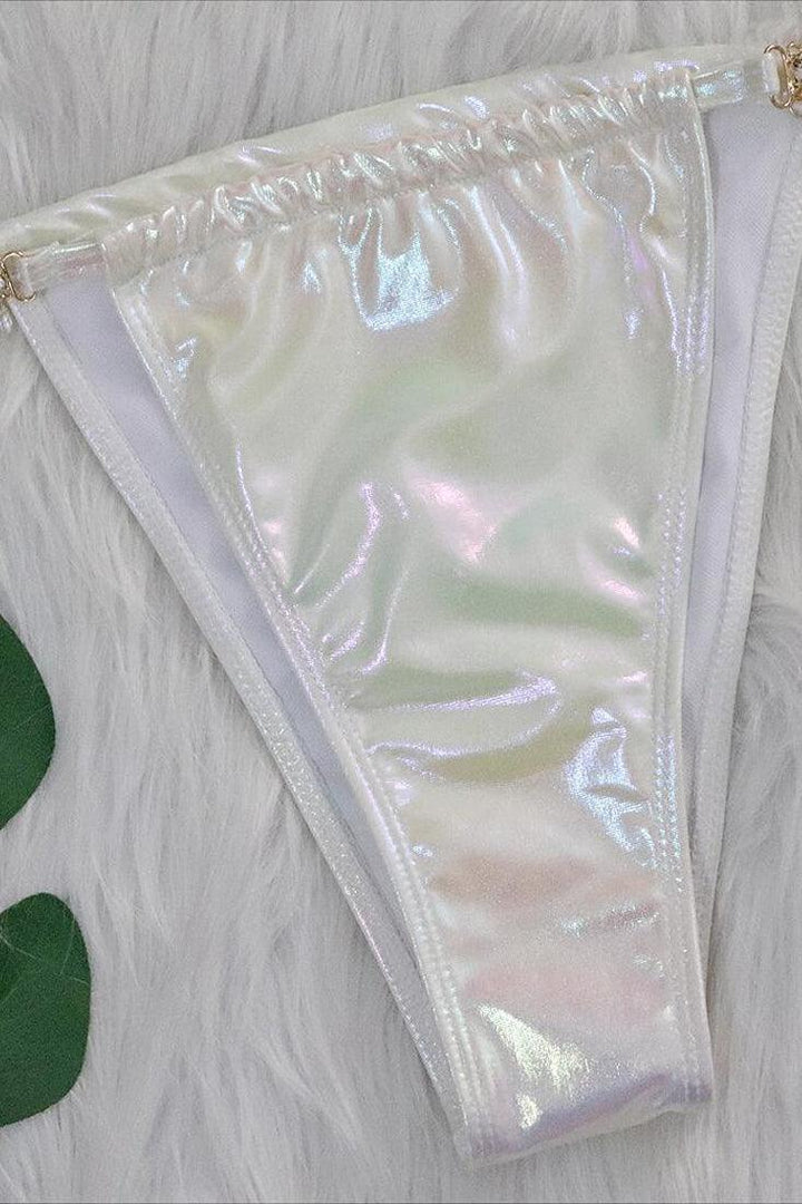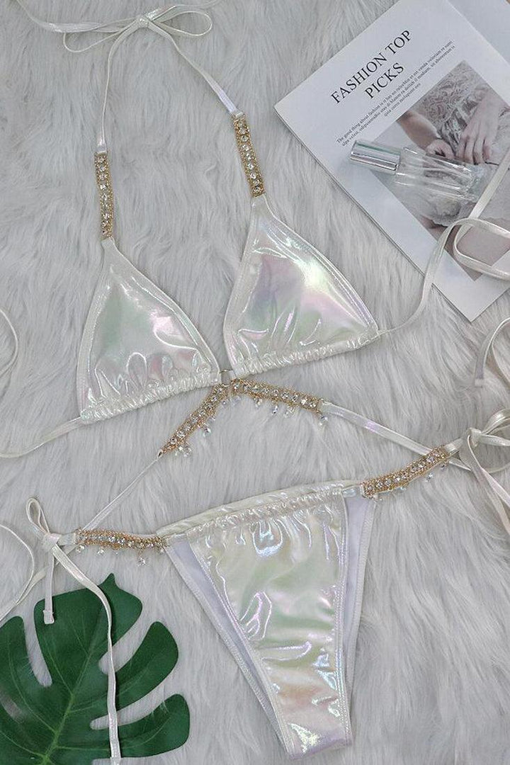 White Holographic Rhinestone Starfish Strappy Draw String Cheeky 2Pc Swimsuit Set Bikini