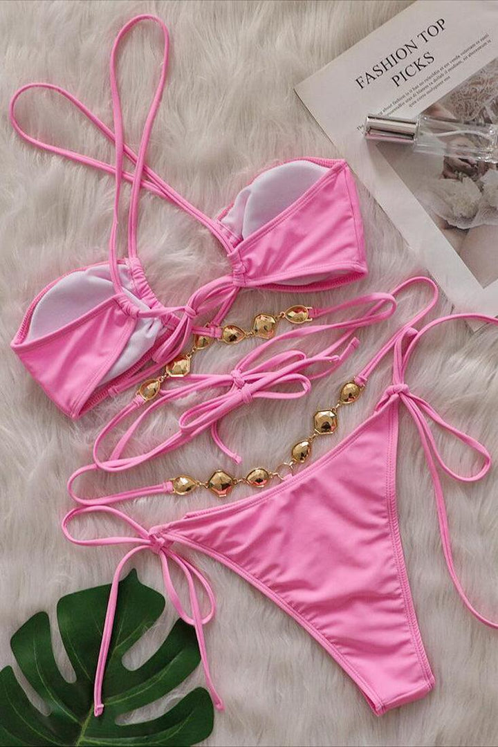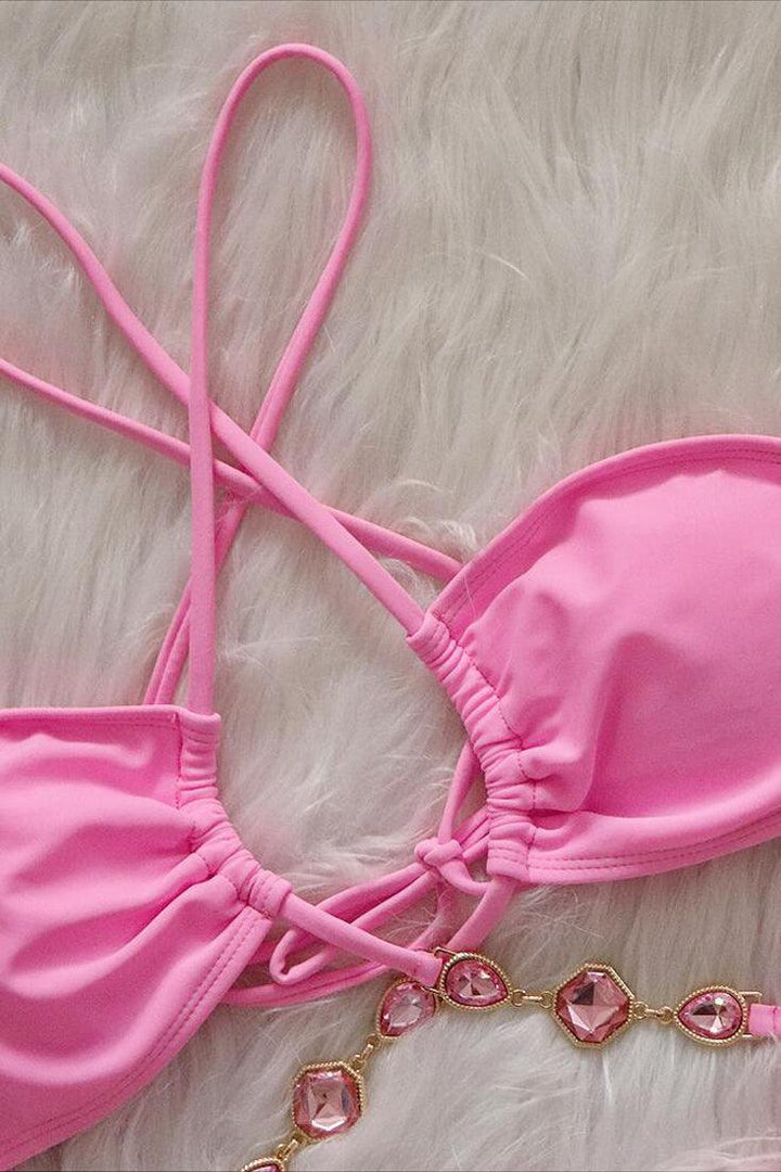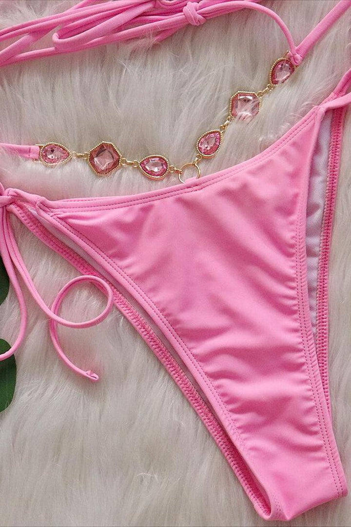 Pink Rhinestones Strappy Bandeau Halter Cheeky 2Pc Swimsuit Bikini