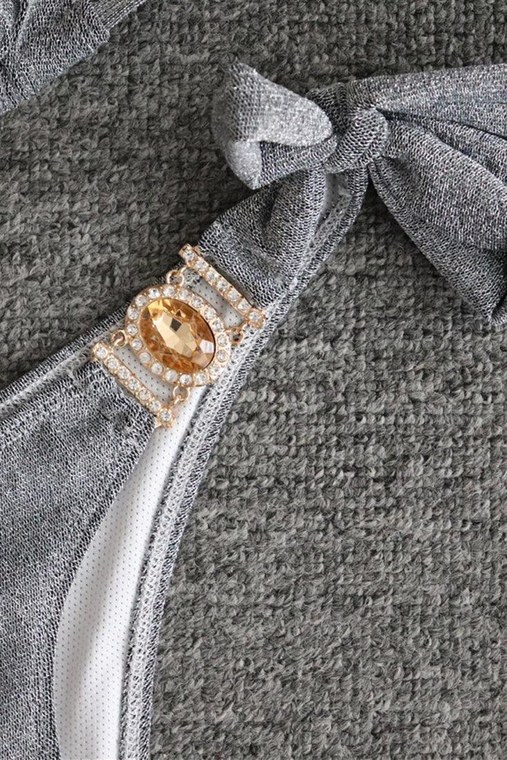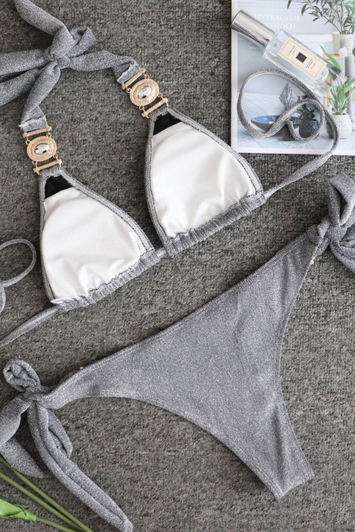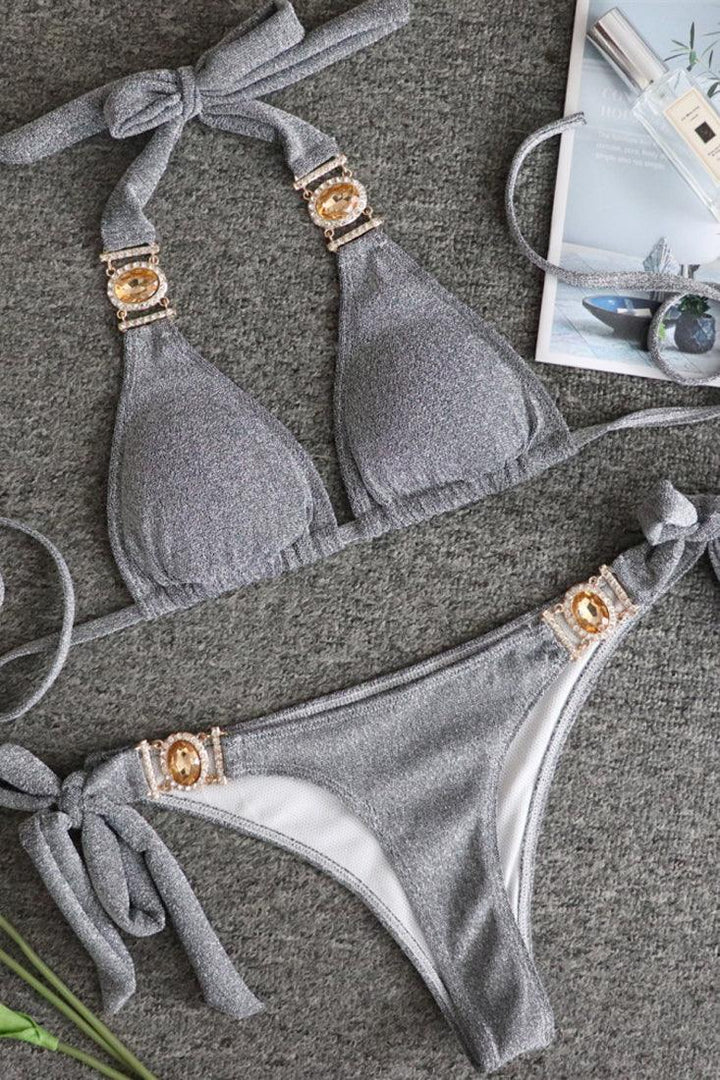 Silver Shimmer Glitter Rhinestone Cheeky Sexy 2Pc Swimsuit Set Bikini