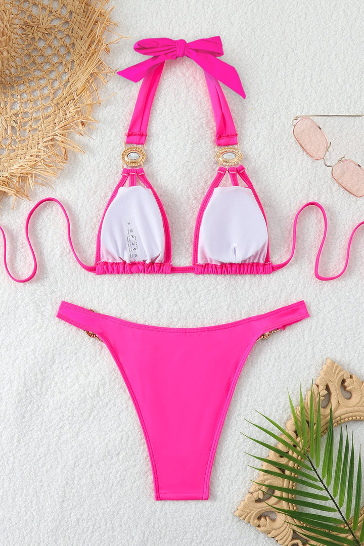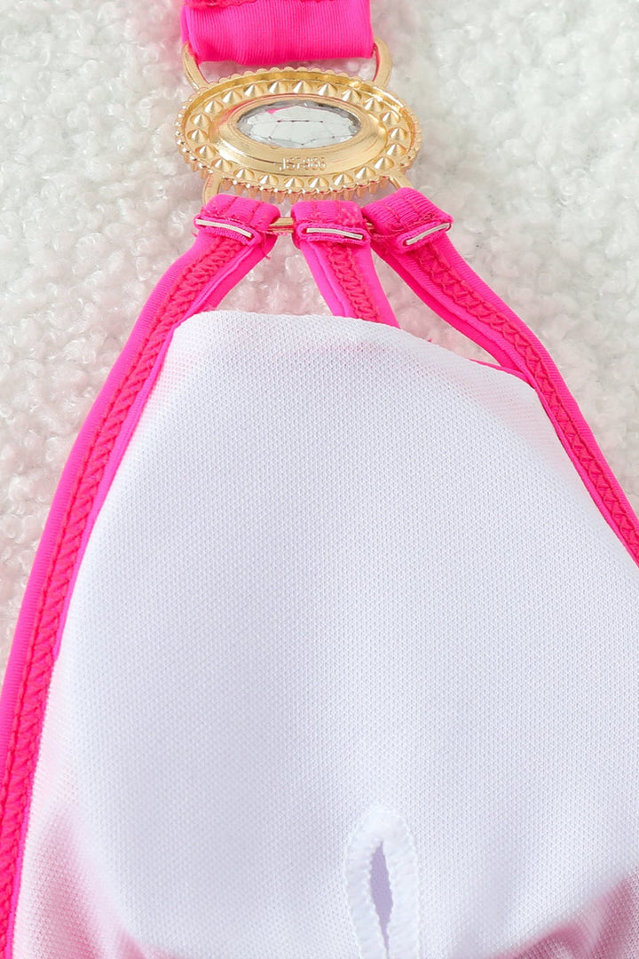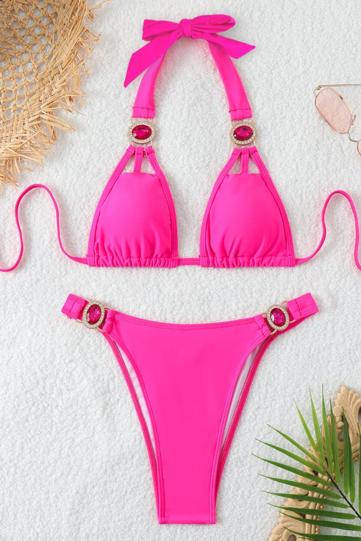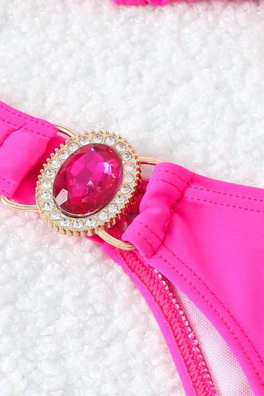 Hot Pink Rhinestone Gem Cut-Out Strappy Cheeky 2Pc Swimsuit Set