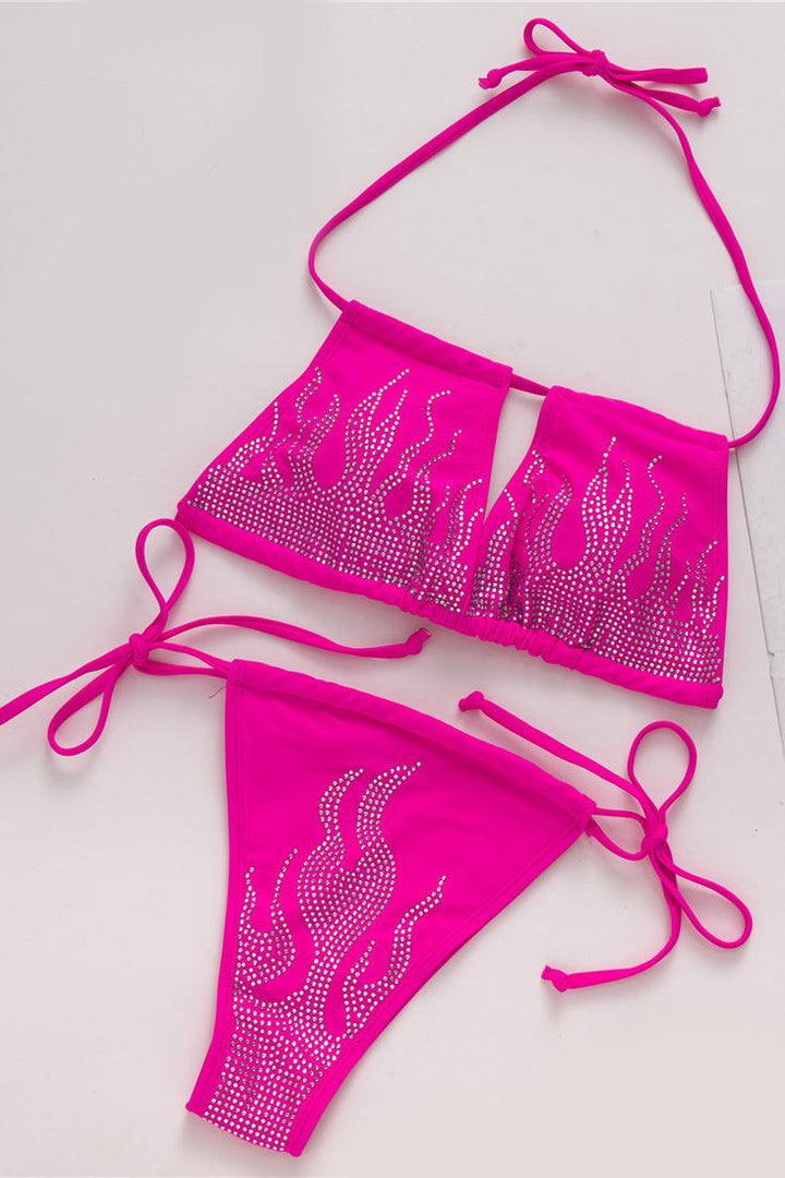 Hot Pink Rhinestone Square Halter Top 2 Pc Bikini Set