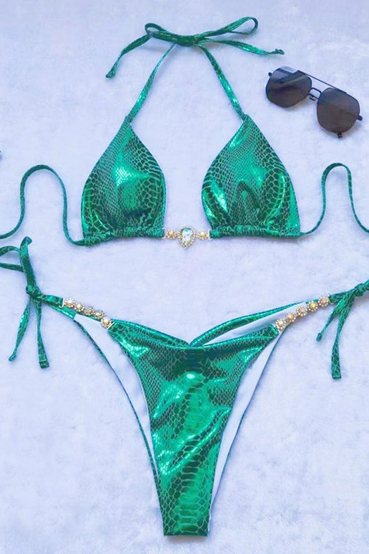 Green Snake Print Metallic Rhinestones Cheeky Ruched Bottom 2Pc Bikini Swimsuit Set