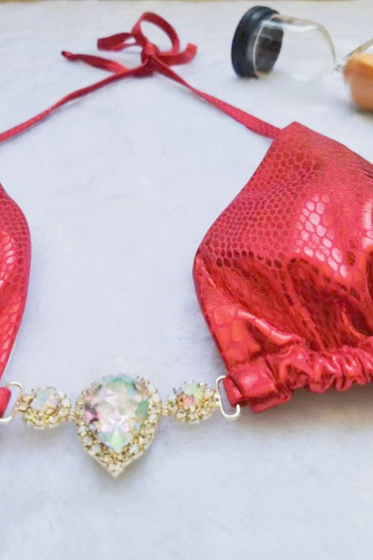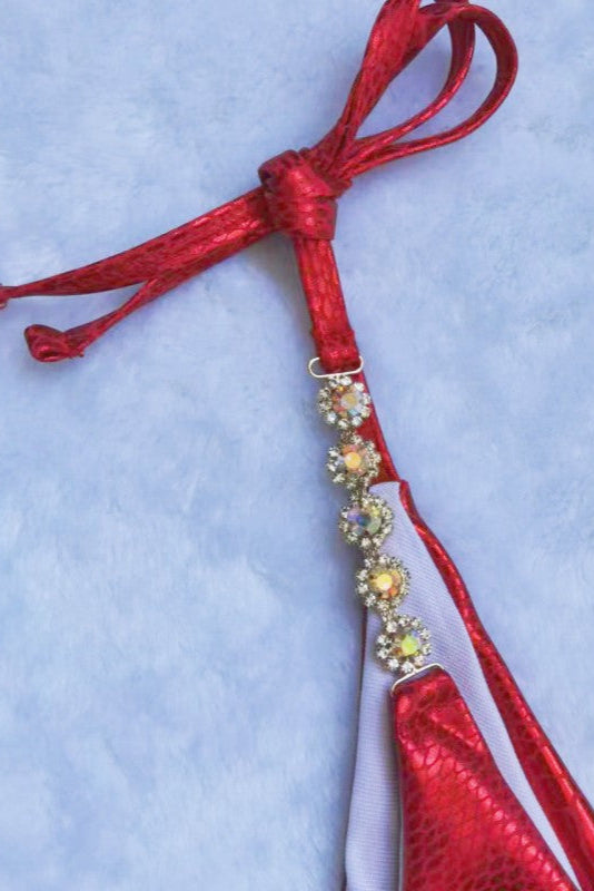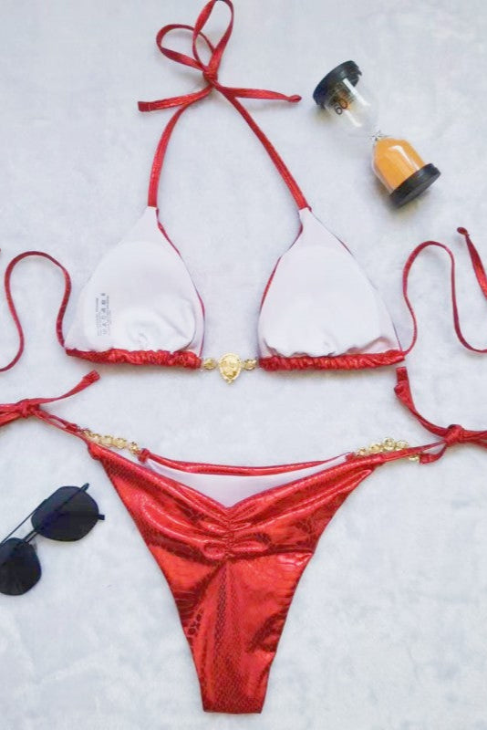 Red Snake Print Metallic Rhinestones Cheeky Ruched Bottom 2Pc Bikini Swimsuit Set