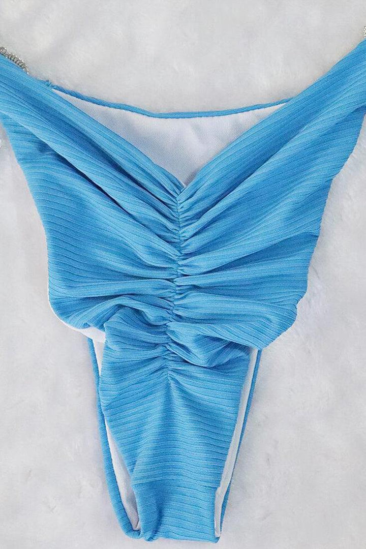 Blue Rhinestone Gem Ruched Halter Cheeky 2 Pc Swimsuit