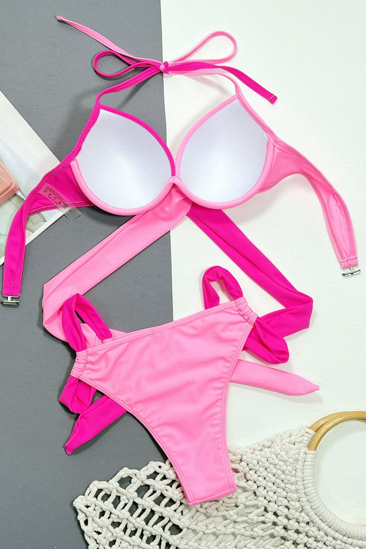 Pink Color Block Wired Push-Up Cup Wrap Strappy Cheeky 2Pc Swimsuit Set