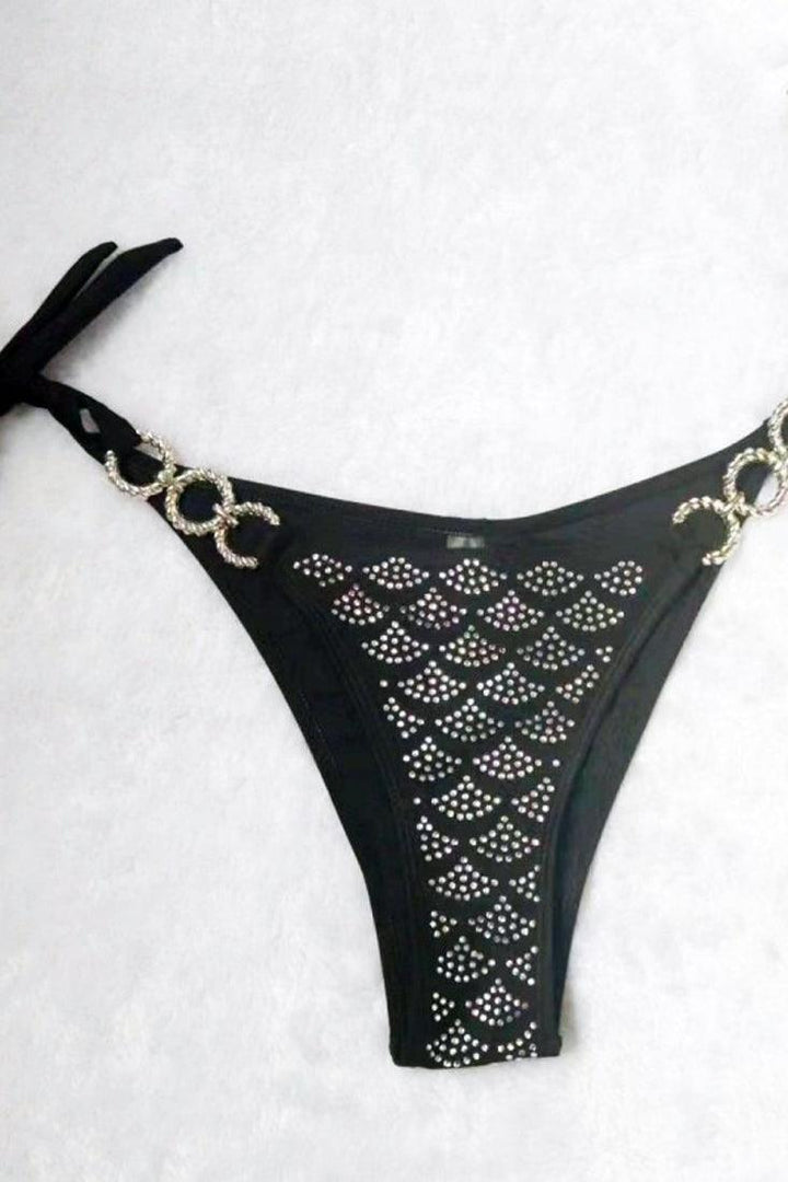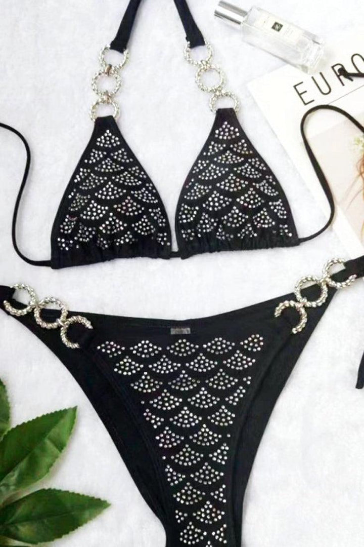 Black Rhinestone Covered O-Ring Cheeky 2Pc Sexy Swimsuit Bikini