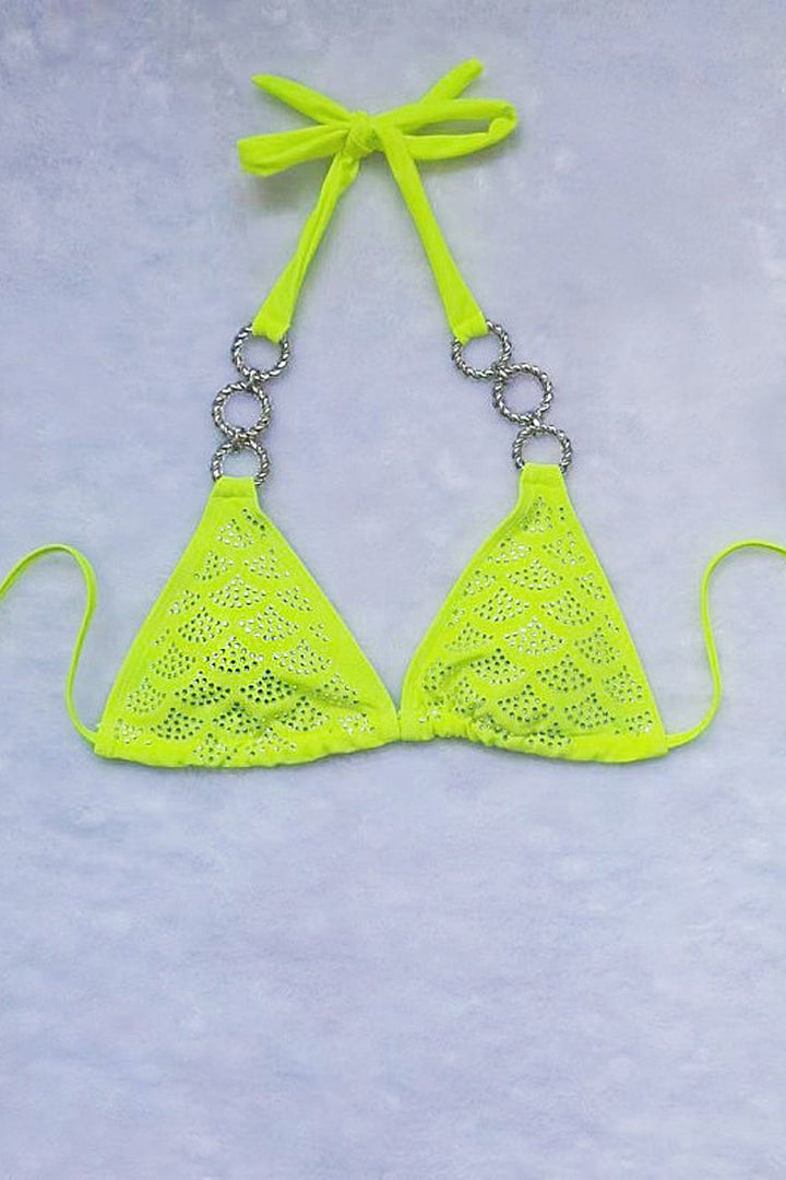 Dazzle in this Neon Yellow Rhinestone Covered O-Ring Cheeky 2Pc Sexy Swimsuit Bikini. The shimmering rhinestones add a touch of glamour while the cheeky style and O-ring detail provide a playful and flirty look. Get ready to make a statement at the pool or beach!