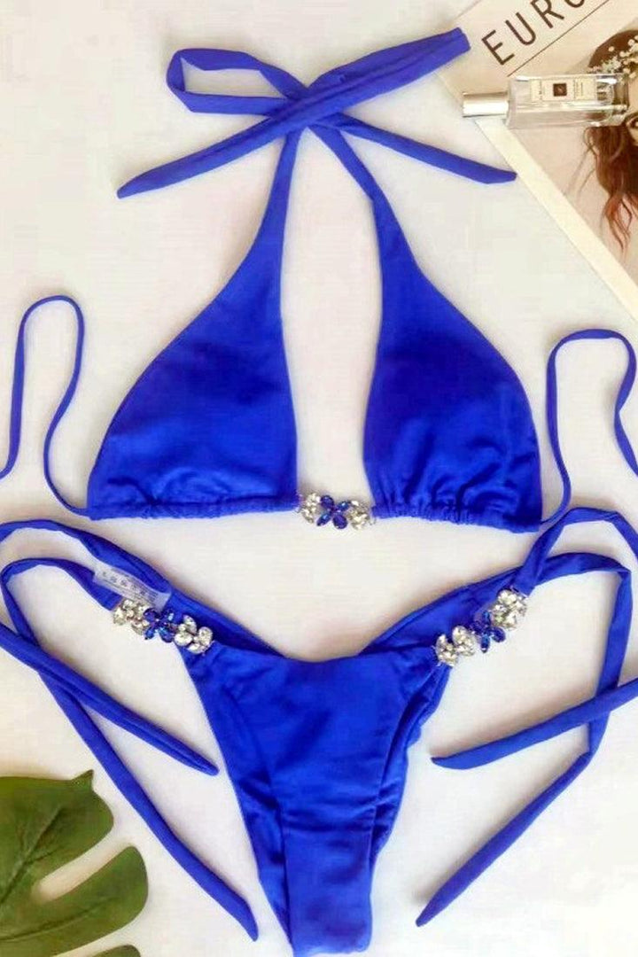 Royal Blue Rhinestone Gem Halter Cheeky Sexy 2Pc Bikini Swimsuit Set