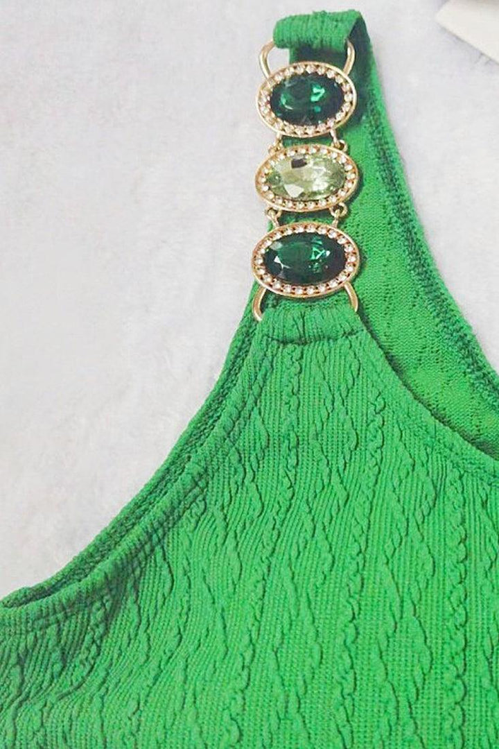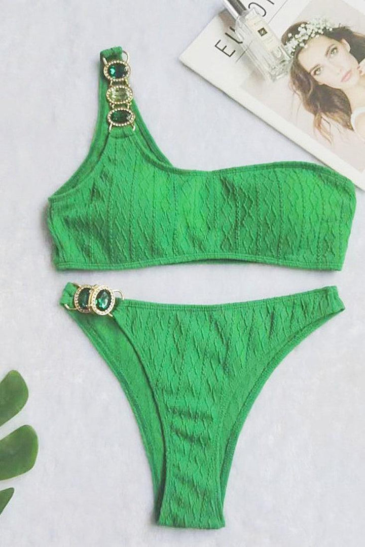 Green Rhinestone Gem One Shoulder 2Pc Bikini Sexy Swimsuit Set