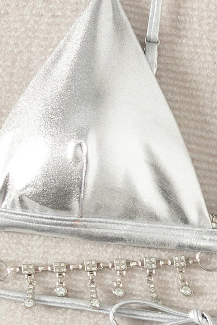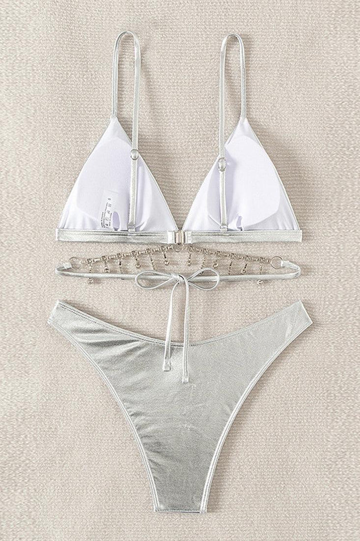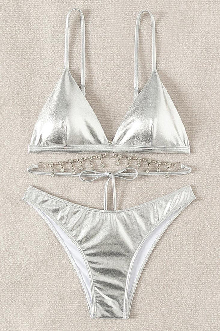 Silver Metallic Rhinestones Strappy Cheeky 2Pc Swimsuit Set