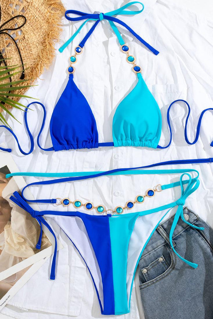 Blue Color Block Rhinestone Gem Strappy Triangle Cheeky 2Pc Swimsuit Bikini