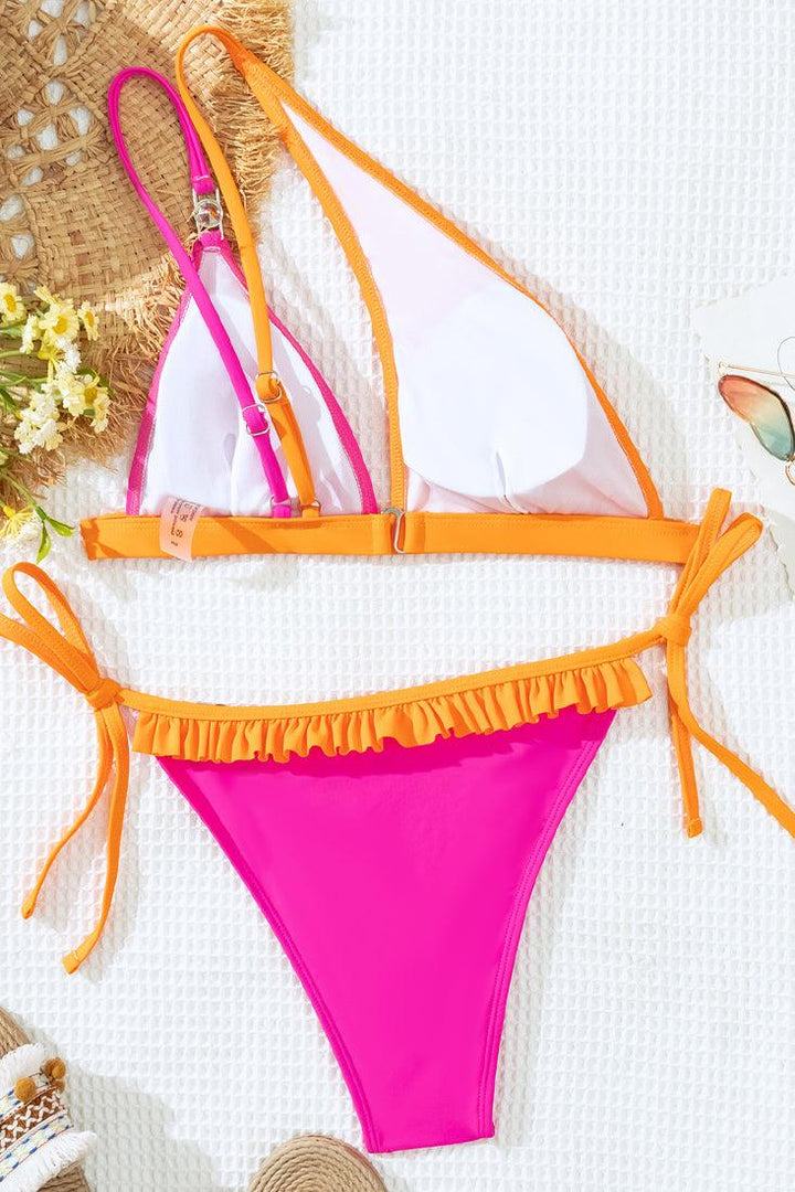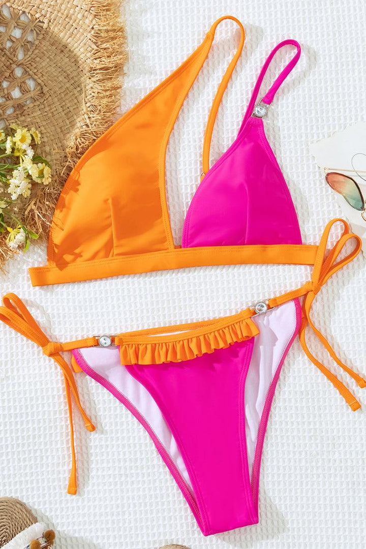 Orange Pink Rhinestone Ruffle One Shoulder Cheeky 2Pc Sexy Swimsuit Set Bikini