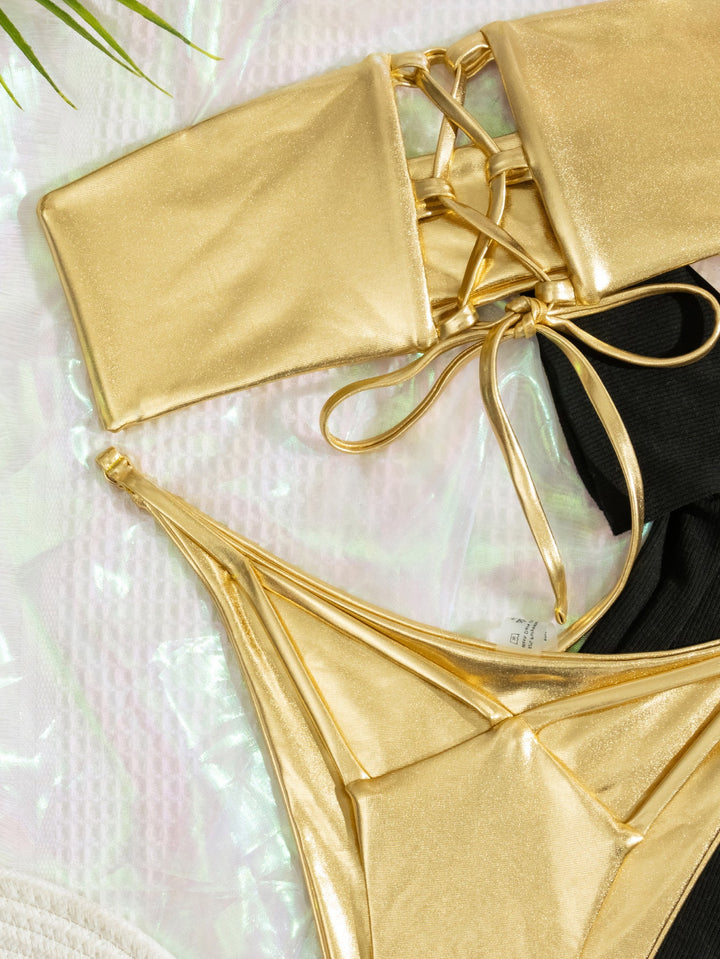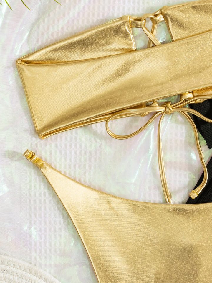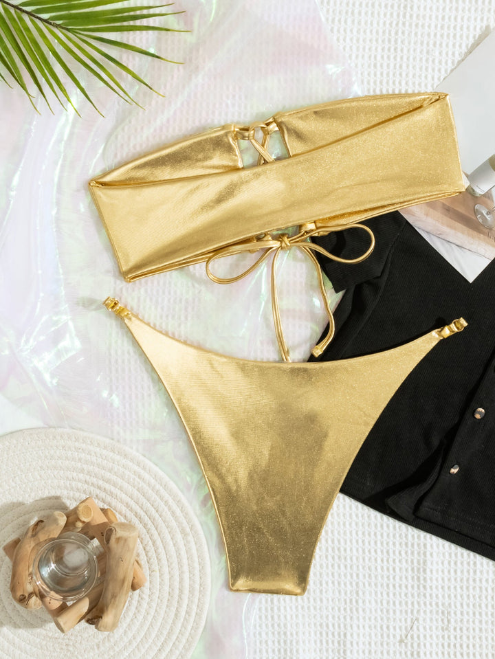 Gold Metallic Cut-Out Strappy Bandeau Cheeky Sexy 2Pc Swimsuit Set