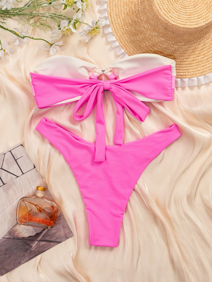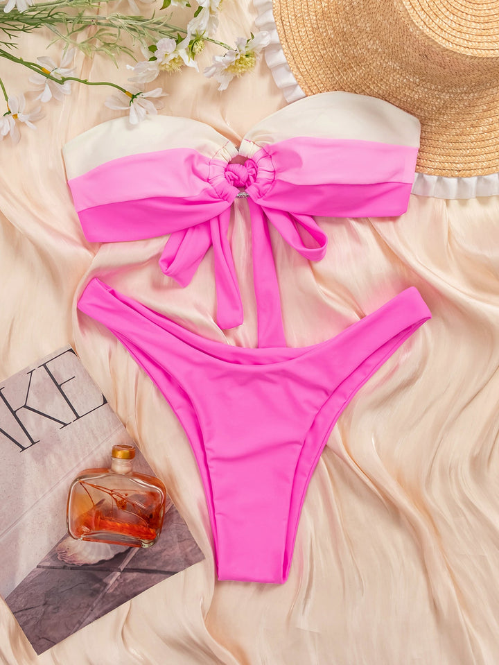 Pink White O-Ring Bandeau Sexy Cheeky 2Pc Swimsuit Set Bikini