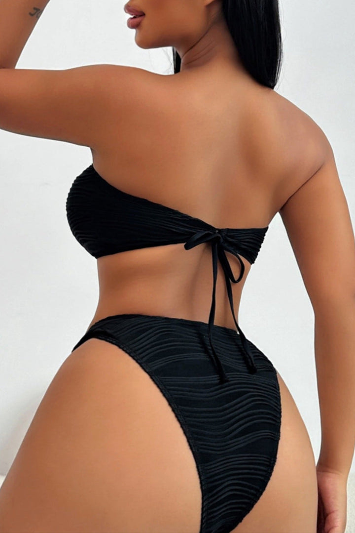 Black Textured Fabric Gold Decor Bandeau Sexy 2Pc Swimsuit Set Bikini