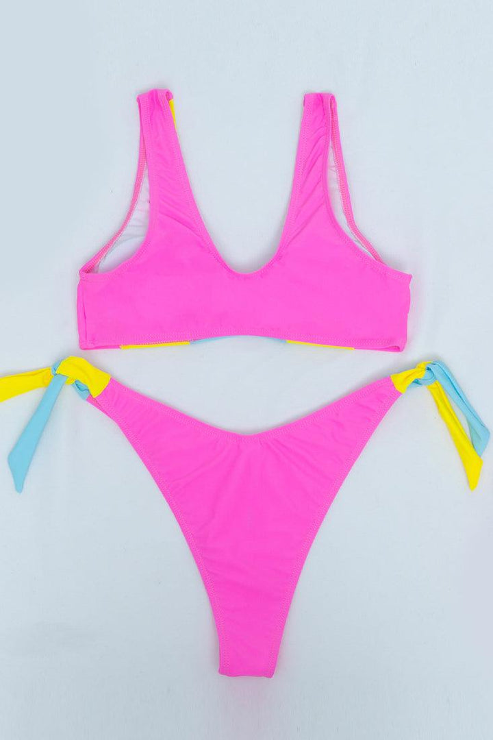 Pink Color Block Scooped Thick Straps 2 Pc Bikini Set