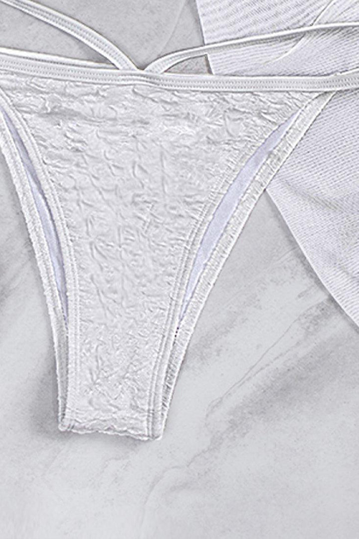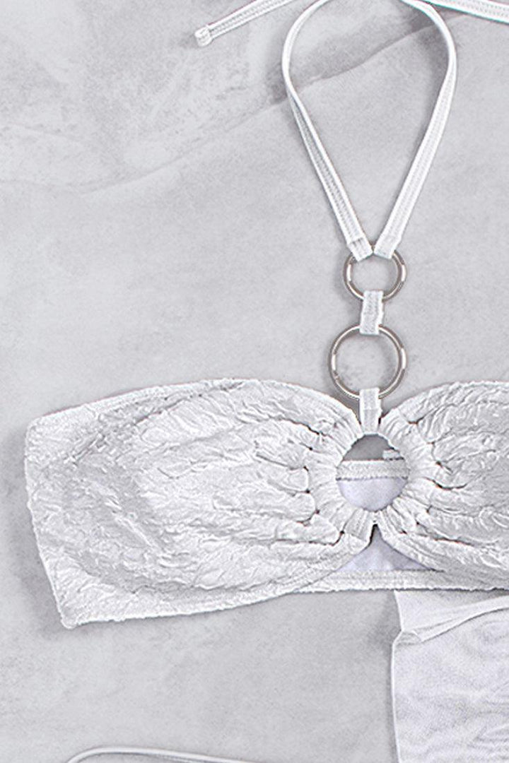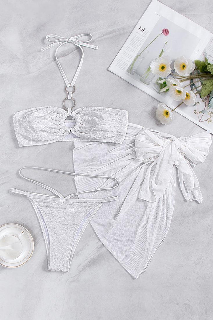 White Bandeau Halter Strappy O-Ring Cheeky Cover-Up 3 Pc Sexy Swimsuit Set