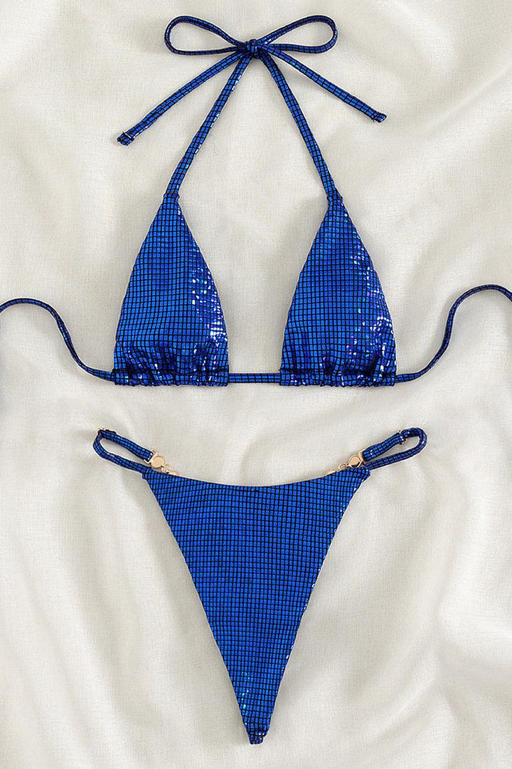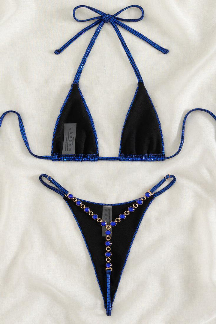 Royal Blue Holographic Rhinestone Thong 2Pc Swimsuit Set Bikini