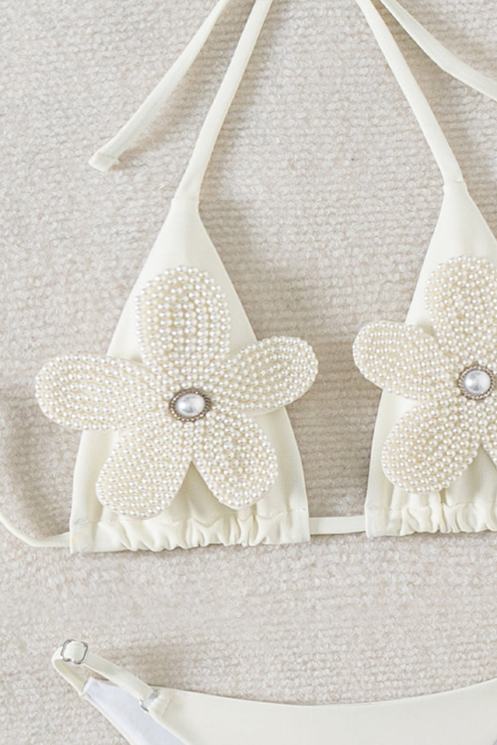 White Pearl Rhinestone 3D Flowers Sexy 2Pc Swimsuit Set
