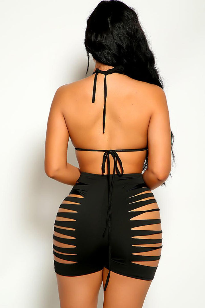 Be summer ready in this super stylish swimsuit! Featuring; sleeveless, triangle top, tie straps, razor cut detail, matching shorts. Followed by a fitted wear. 90% Polyester, 10% Spandex