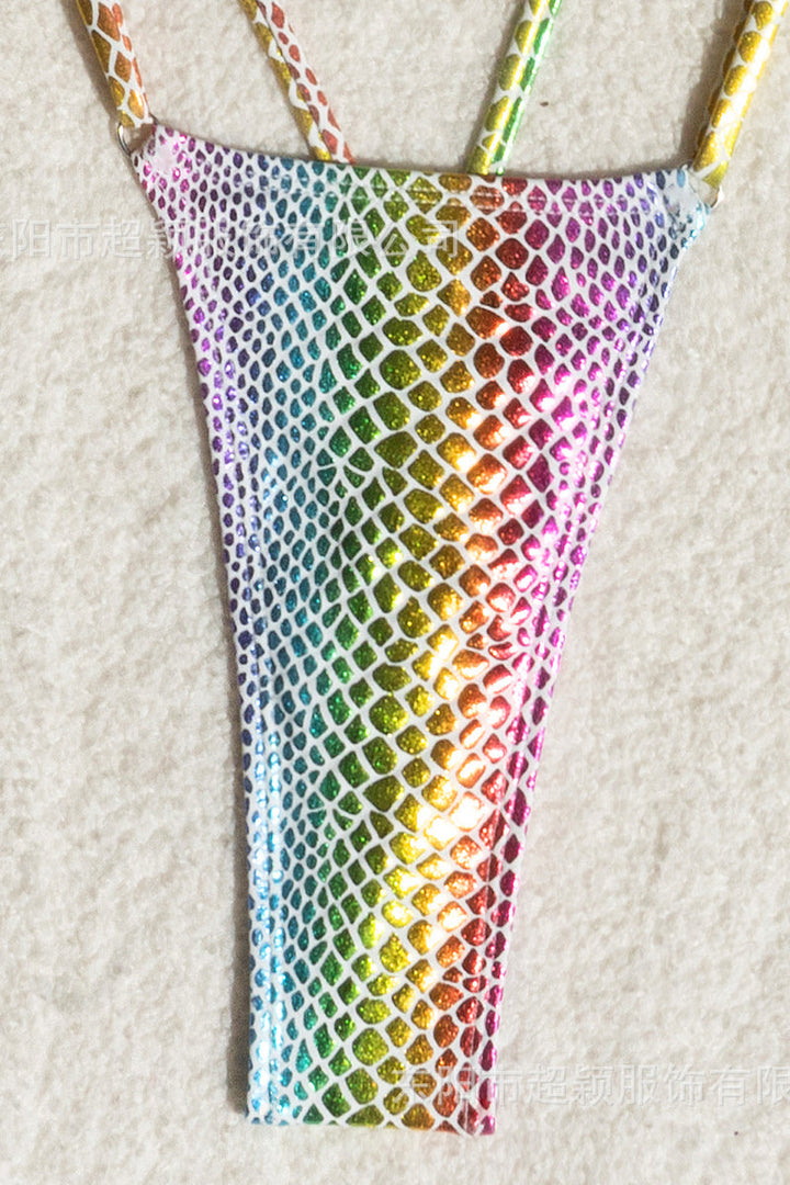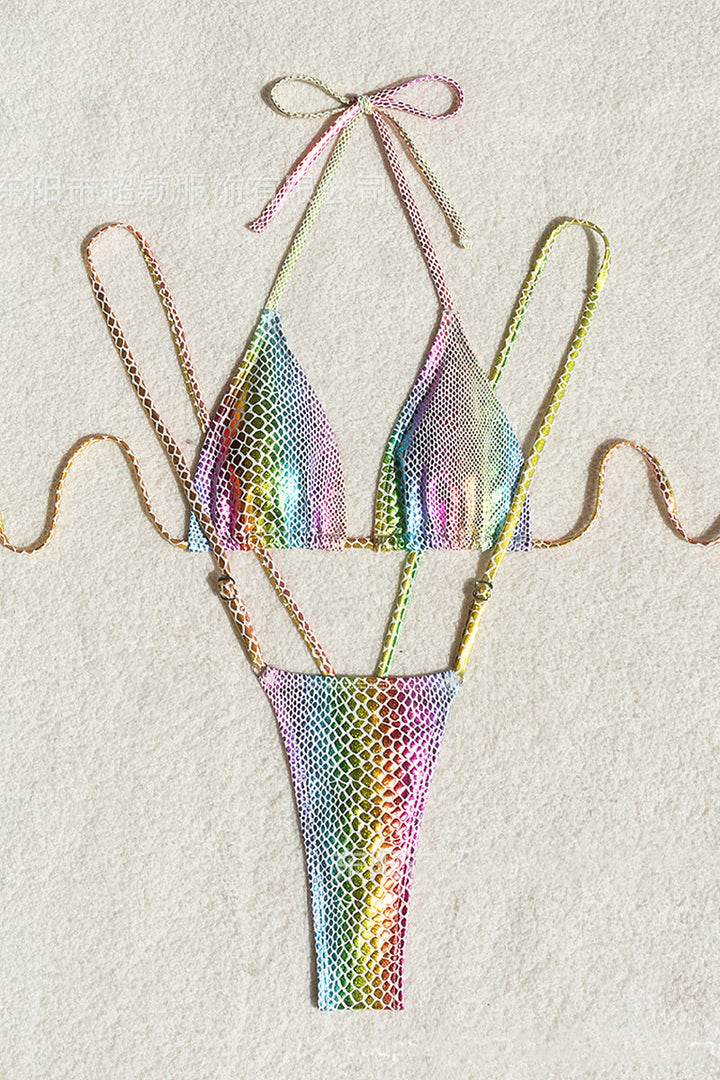 Rainbow Metallic Snake Strappy Triangle Thong Suspenders Sexy 2Pc Swimsuit Set