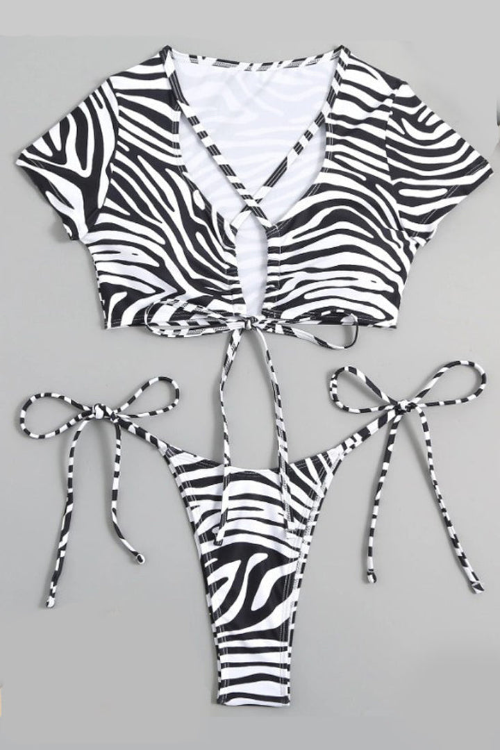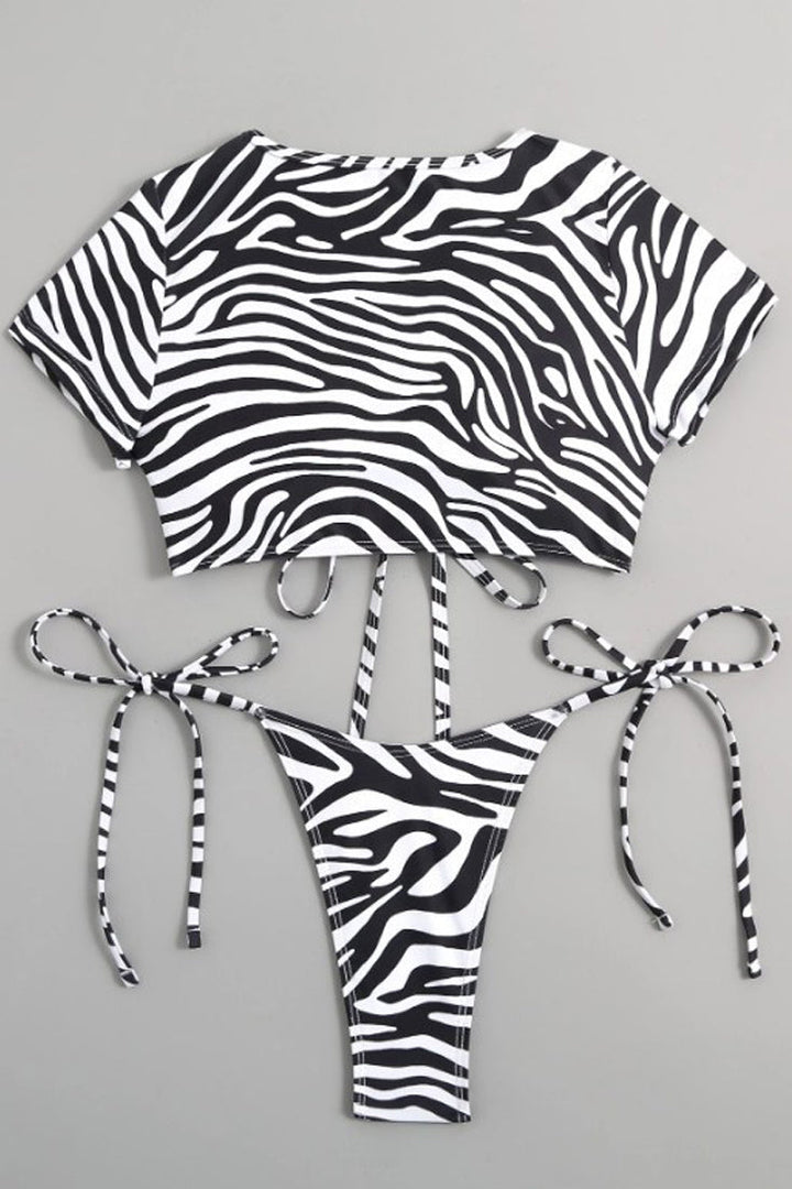 Black White Zebra Print Short Sleeve Lace-Up Cheeky 2Pc Sexy Swimsuit