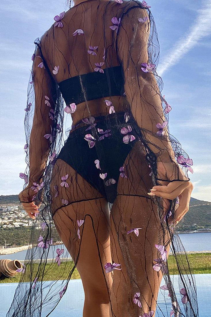 Black Butterfly Print Bandeau Mesh Sexy Four Piece Swimsuit