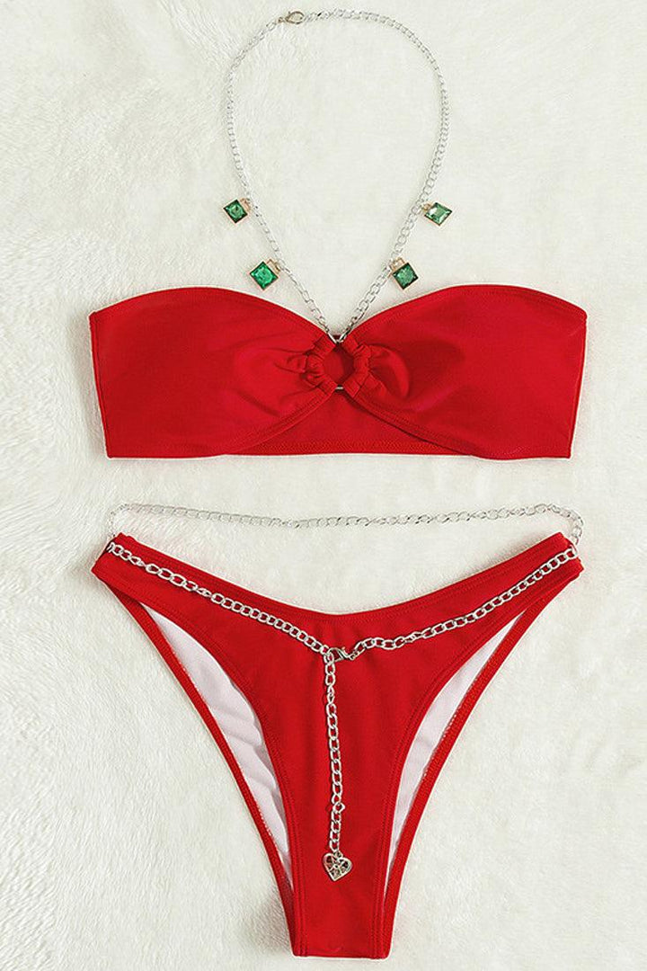 Red Chain Rhinestone Accent Halter Two Piece Swimsuit