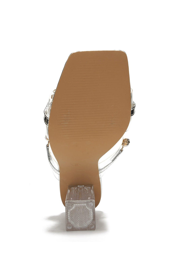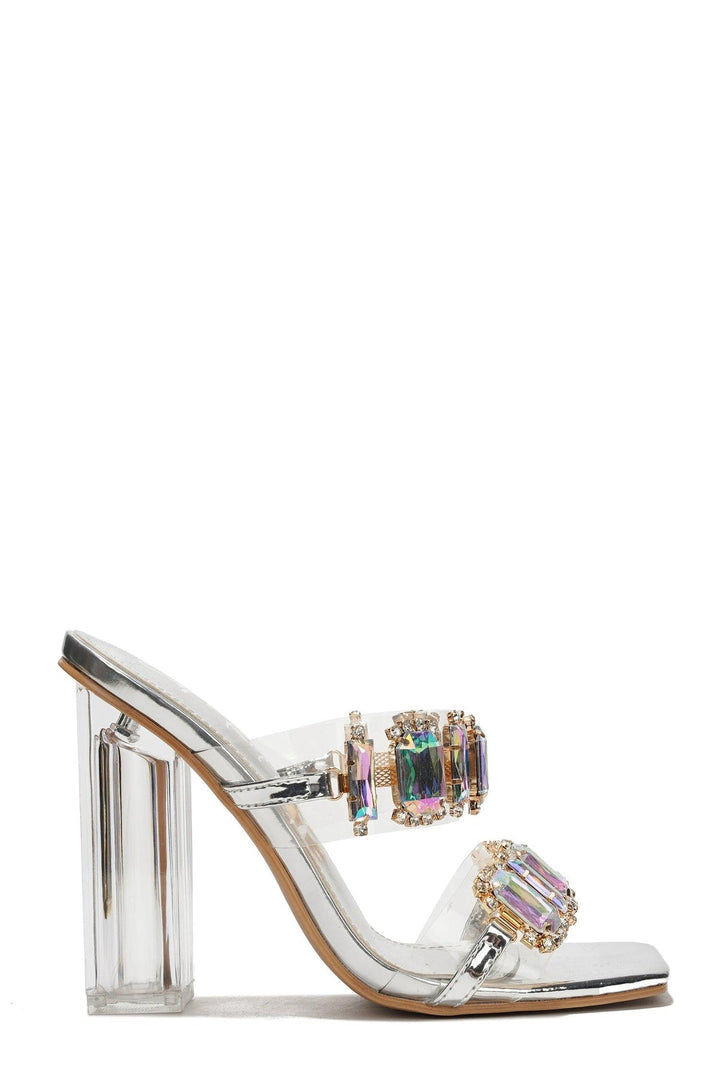 SYLVIA - SILVER - HEELS by CAPE ROBBIN square toe high block heel embellishment clear strap and heel PU lightly cushioned footbed rubber outsole Indulge in Sylvia's radiant glow! These stunning heels showcase dazzling gem accents,a lustrous metallic finish,and transparent block heels. The ultimate choice for a sparkling Friday night with friends.