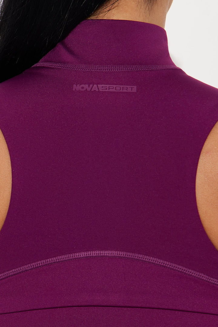 Available In Plum. | Active Top | Mock Neck | Sleeveless | Elevate | Seaming Details | Full Zip | High Impact | Stretch | Pair with "Run It Up Elevate Capri Active Legging" | Body: 73% Polyester 27% Spandex | Inner Mesh: 82% Nylon 18% Spandex | Imported